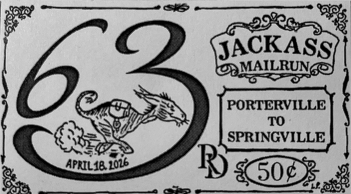 Each Year a Special Stamp is produced by the Mail Run Committee and sold at several Business in Porterville & Springville. With this Stamp along with standard USPS postage Letters and Postcards dropped into Special Jackass Mailboxes will be loaded onto the Jackass Mail Wagon from Porterville to Springville and on to it's destination anywhere in the World.